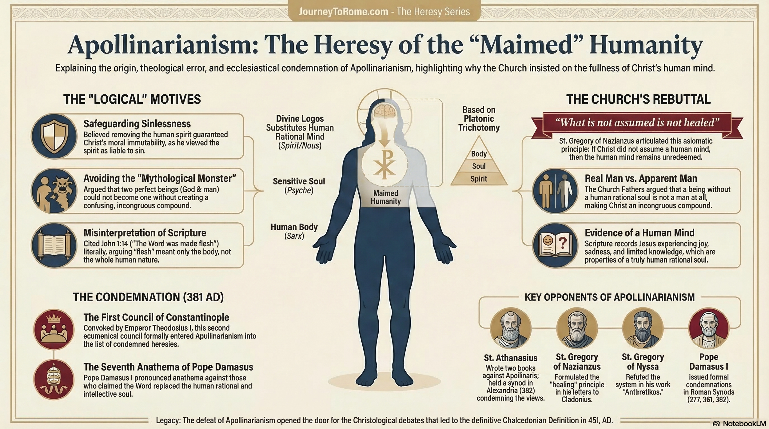 The refutation came from the Cappadocian Fathers, especially Gregory of Nazianzus, who articulated a principle that became axiomatic: what is not assumed is not healed. The entire purpose of the Incarnation is that the Son of God took on human nature so that human nature could be redeemed from within. If Christ did not have a human rational soul, then human rational souls are unredeemed.