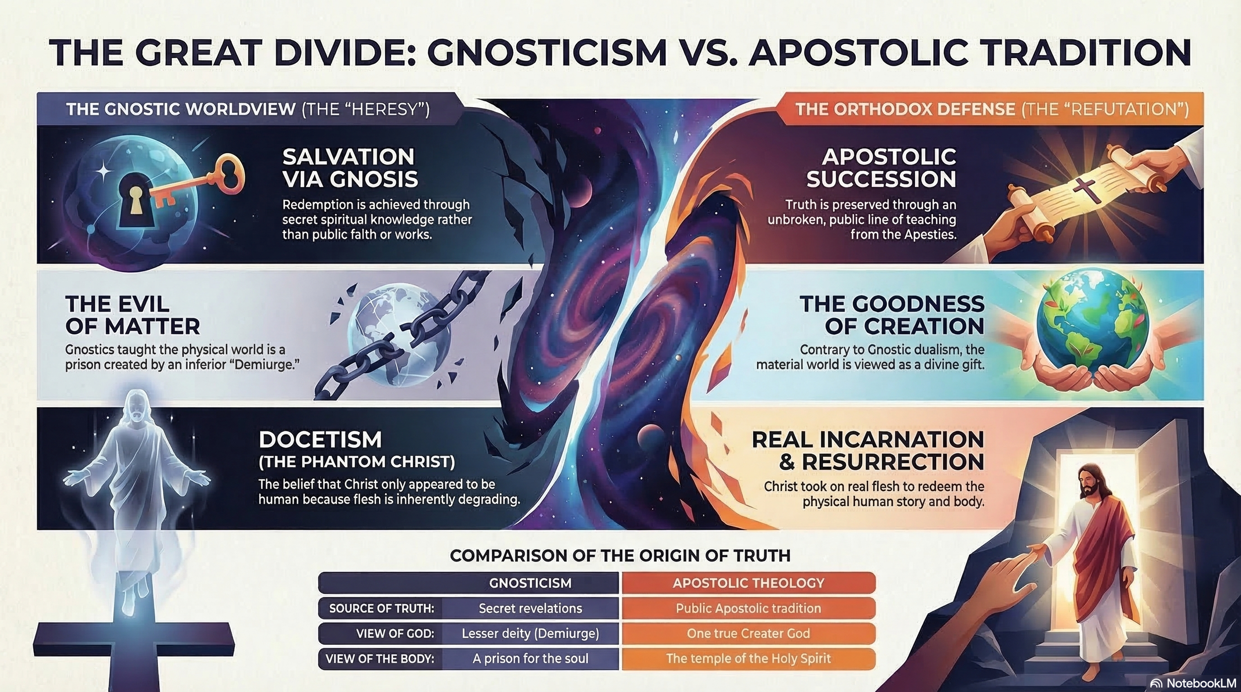 Gnosticism contradicts the faith at almost every point. The God of Genesis who looked at creation and called it very good is not an ignorant lesser deity. The Incarnation was not a cosmic trick. Christ did not merely appear to suffer and die; he actually did, and that matters enormously, because a phantom's death saves no one. The resurrection of the body, so central to Christian hope, is meaningless if the body is evil by nature.