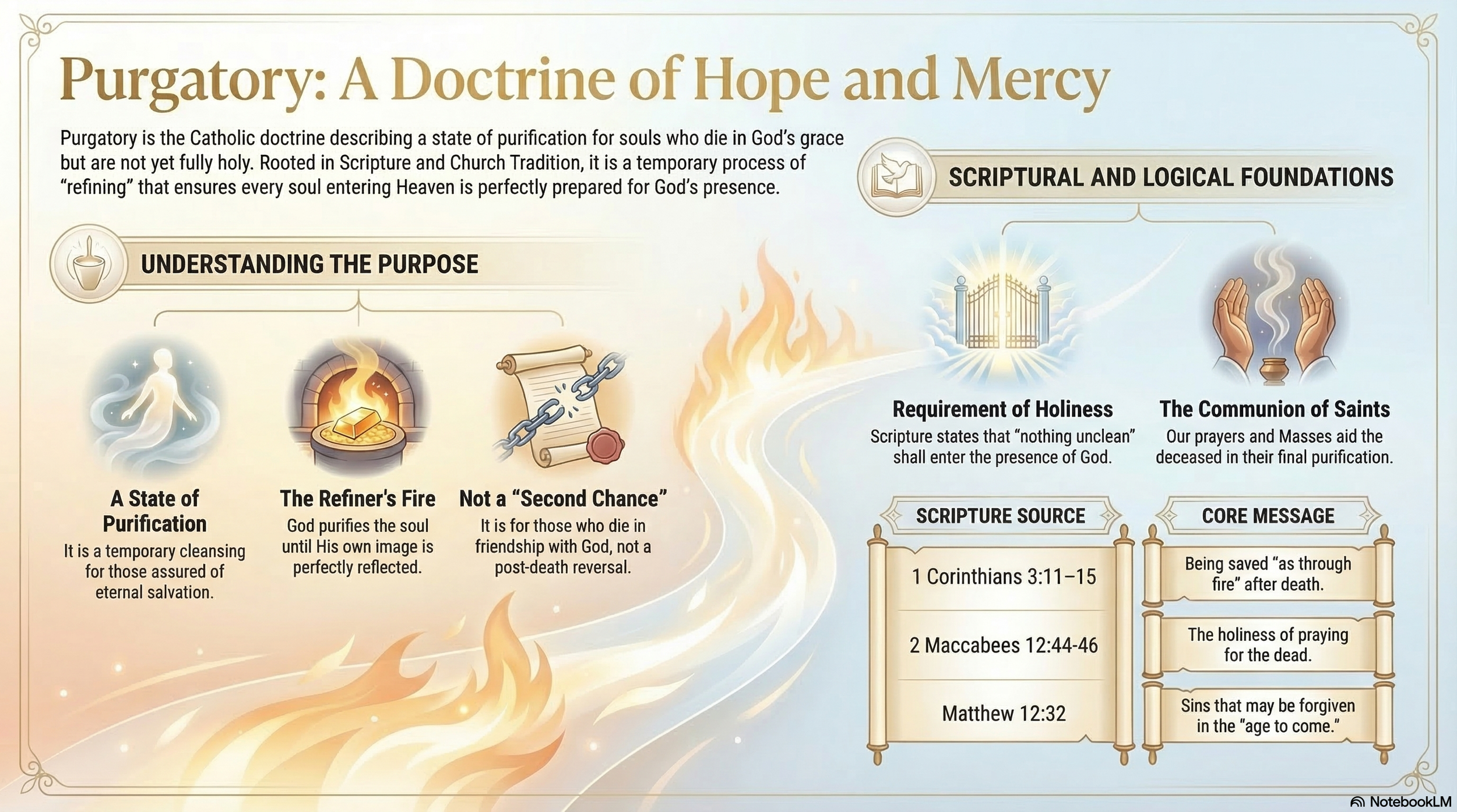 Purgatory is the logical consequence of God's justice and mercy: a purification for souls not damned, but not yet fully holy.